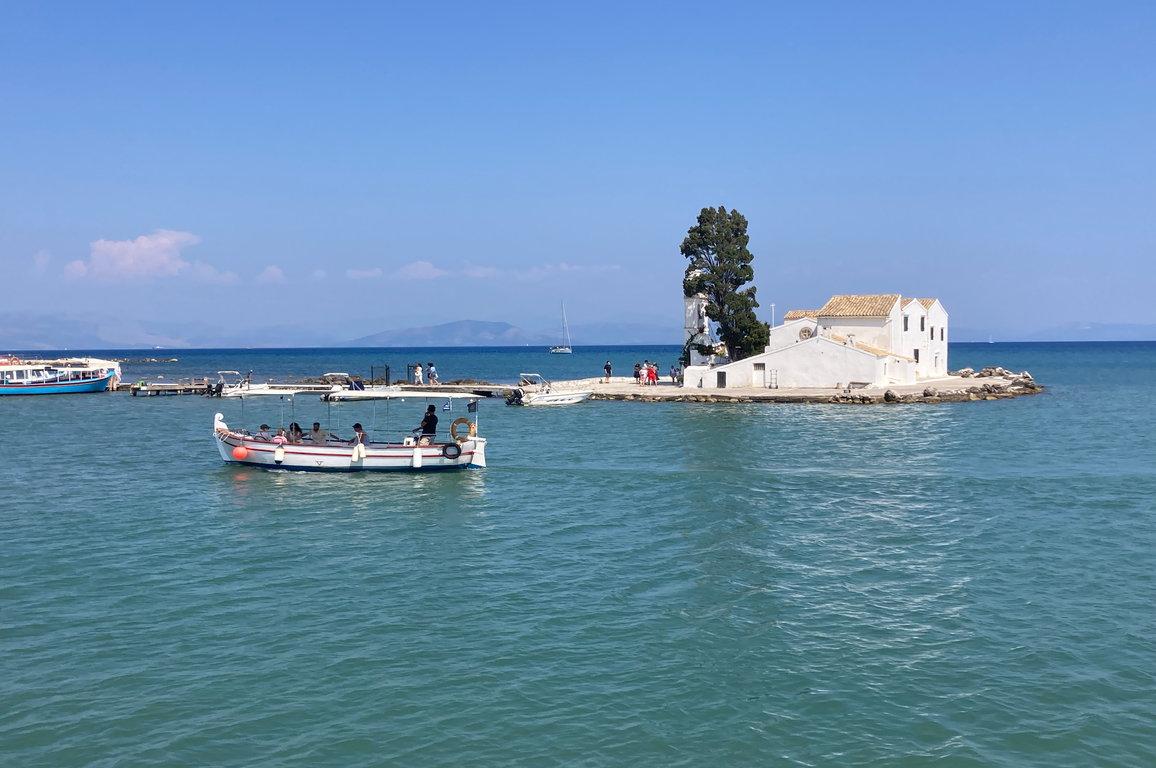 Nur etwa 100 Meter vor der Küste liegt die romantische Insel Pondikoníssi, die bequem per Boot vom Damm der Klosterinsel Vlahérna erreichbar ist. Diese „Mäuseinsel“ ragt ein paar Meter aus dem Wasser und ist dicht bewaldet. Auf ihrem höchsten Punkt steht eine kleine Kapelle aus dem 12. Jahrhundert. Eine Plakette erinnert an Kaiserin Sissi, die diese Insel besonders schätzte und oft besuchte.